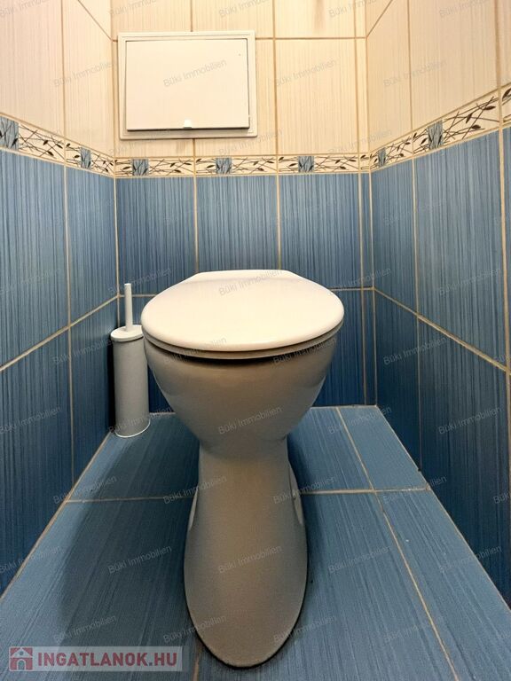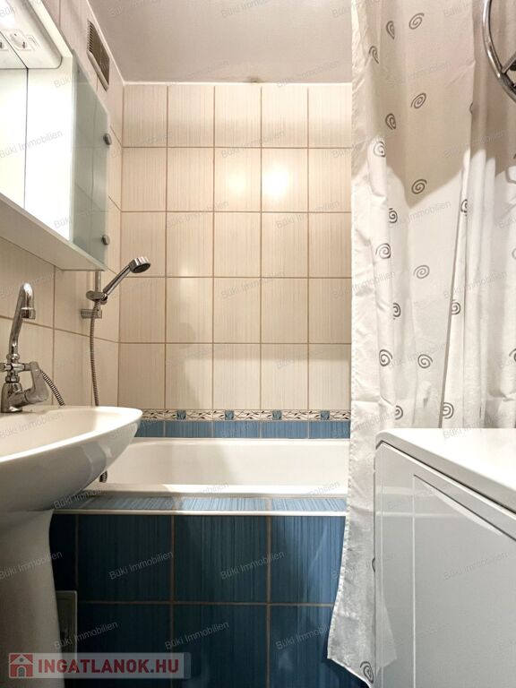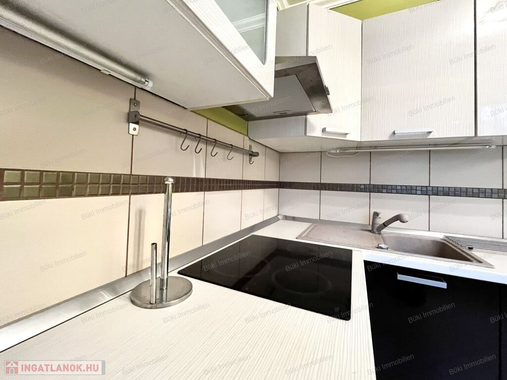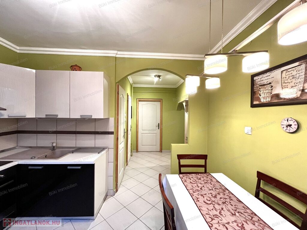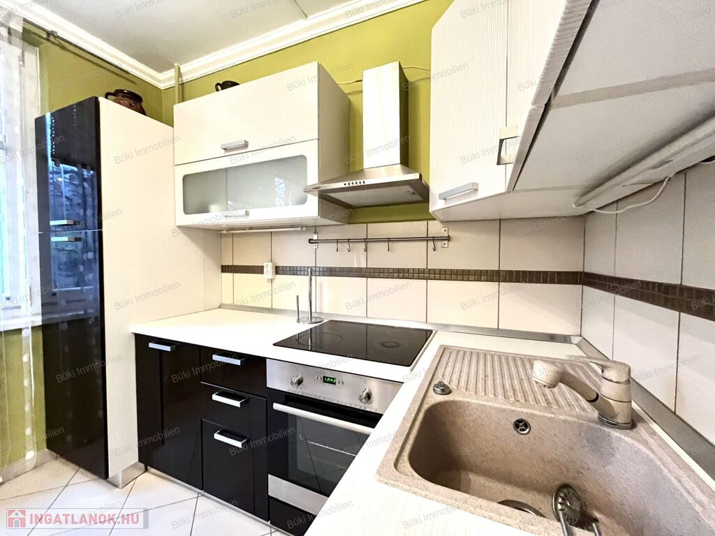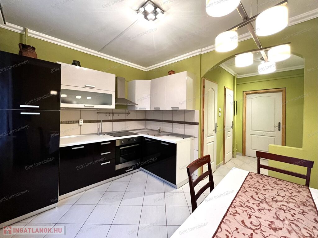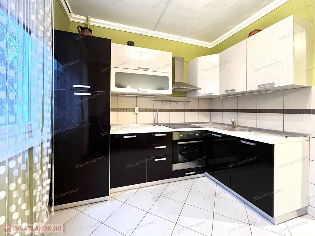 A folyosóról jutunk el a tágas, valóban élhető méretű konyha–étkezőbe, ahol kényelmesen elfér egy nagyobb étkezőasztal is. A modern, magasfényű beépített konyhabútor, a sütő, főzőlap és az elszívó is a kényelmet szolgálja, a helyiség világos és jól szellőztethető. A fürdőszoba praktikus kialakítású, minden kézre áll, a WC külön helyiségben található, ami a mindennapokat még kényelmesebbé teszi.